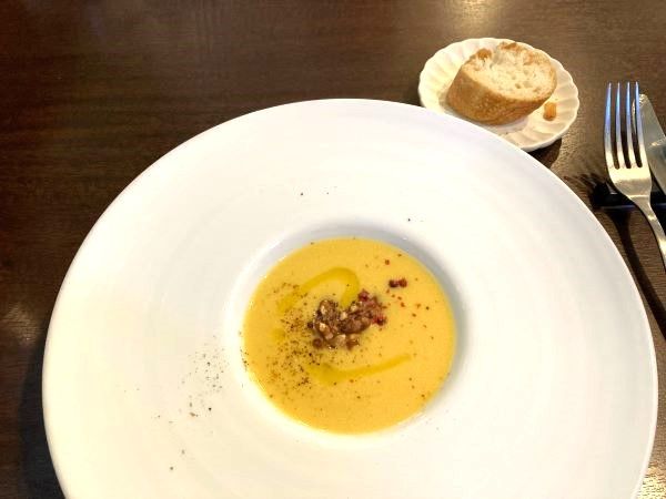 スープはバターナッツカボチャのスープで、さつまいものような甘み。