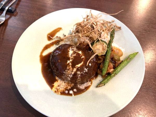 鹿のレアハンバーグ ¥1,600 は、ライスや焼き野菜と一緒にワンプレート。