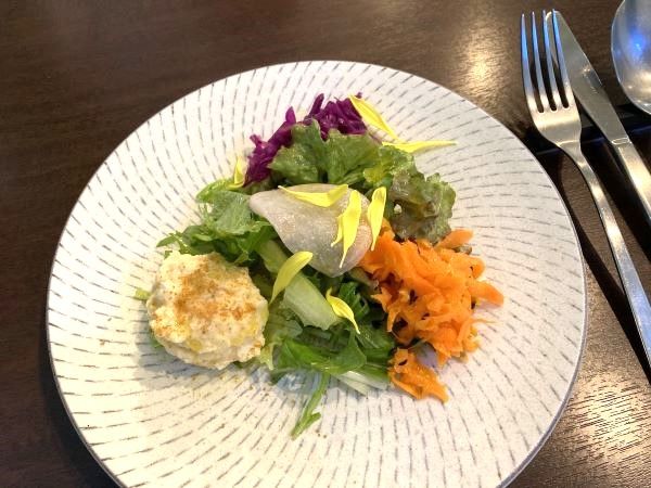 まずはサラダ。たっぷりのレタスや水菜にクミンが効いているキャロットラペ、甘酸っぱい紫キャベツのマリネ、からすみポテトサラダも入っていてワインが欲しくなる!
