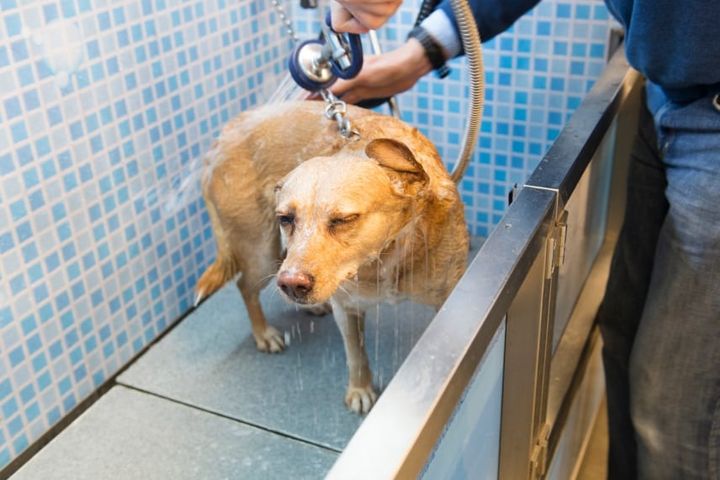シャンプーする飼い主は、イヌがいつ水しぶきを飛ばさないか怯えている / Credit:Canva