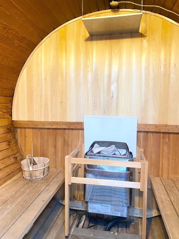 グランピングドームの部屋の横に、プライベートのバレルサウナが付いています。