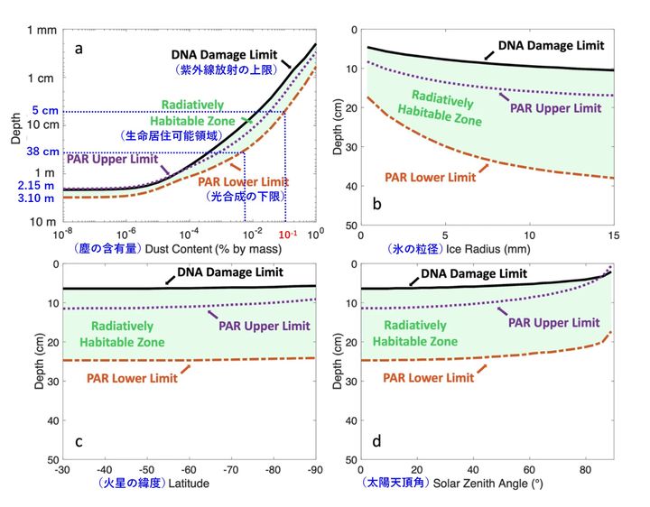 下図では、「塵の含有量」、「氷の粒径」、「火星の緯度」、「太陽天頂角」に対する「氷の深さ」で「生命居住可能領域」の各範囲を示しています。
