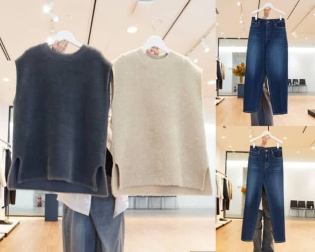 高級感のあるミンク調の毛足の短いフェザーヤーン素材を使ったボクシーベストを合わせると、いつものカジュアルコーデが一気に格上げされます。