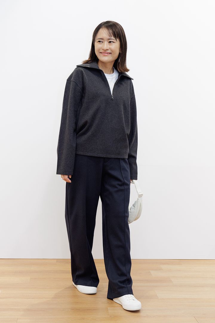 「前が全部開くフルジップのスウェットはスポーティな印象だけれど、ハーフジップなら顔周りにVゾーンを作れてシャープかつ上品に。写真のようなTシャツ合わせのほか、襟付きシャツやタートルにもマッチ。上下セットアップにできるので汎用性が高いのも魅力です。上下ともによく伸びるブラッシュドジャージー素材で着心地抜群! パンツはセンタープレス入りできちんと感があり、ネイビーを選べば遠目にはスウェットとわからないほど」