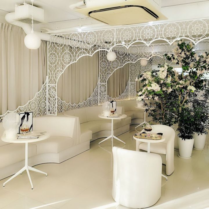 表参道駅から徒歩3分ほどのビルの3Fにある「MOSKA by GingerGarden(モスカ バイ ジンジャーガーデン)」。全面ガラス張りの明るいビルの店内は、ホワイトを基調とし、大理石タイルやモロッカンスタイルのアーチやランプで構成されたラグジュアリーな雰囲気です。