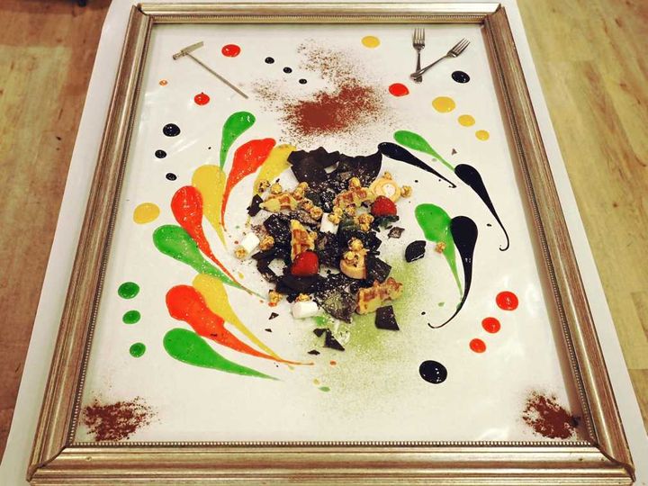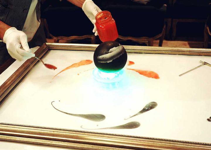 色とりどりのソースを使って、模様が描かれていきます。最後に、ハンマーで割られたチョコレートから現れたのは、ひと口サイズのスイーツたち! 机に広がるスイーツはとってもカラフルで美しく、まるで抽象画のよう。じっくり目で堪能したら、右上に配されたフォークでお好みのスイーツにソースを絡めつついただきます。