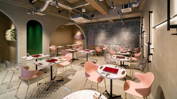 大理石のテーブルと無骨なコンクリートの壁に、大人かわいいペールピンクの椅子が映える、洗練されたガーリースタイルの空間。ピンク、グリーン、パープルのフラワーウォールが彩る3つの半個室も魅力的ですね♪