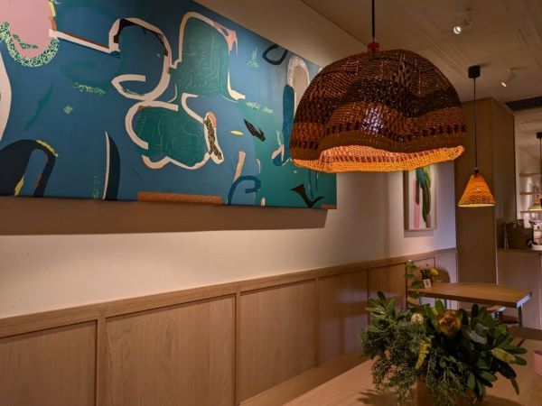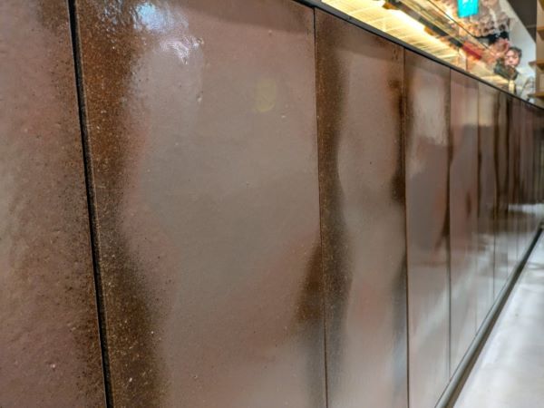 また、既存店のレンガ調の造りとは異なり、こちらではアートな空間を楽しむことができます。例えば、カウンターウォールが岐阜県多治見市のタイルでできていて、シックな色合いに落ち着きを感じることができました。
