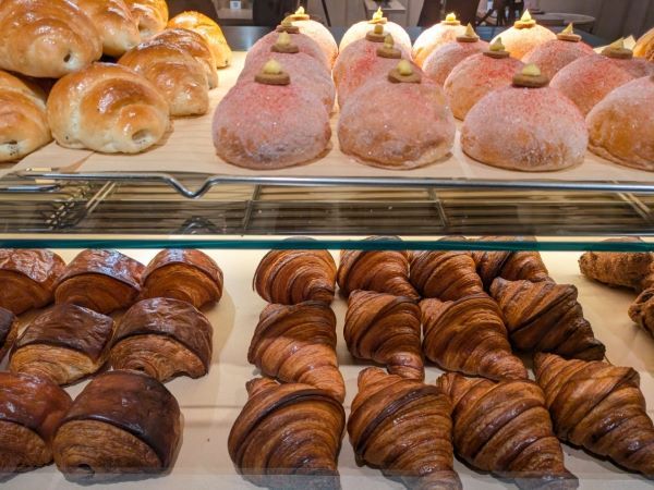 ショーケースには、看板メニューの「白トリュフの塩パン」(248円)をはじめ、コーヒーにぴったりの香り高い「カルダモンロール」(380円)、ピンクが可愛らしい「季節の生絞りクリームパン」(410円)など、人気商品が並んでいます。