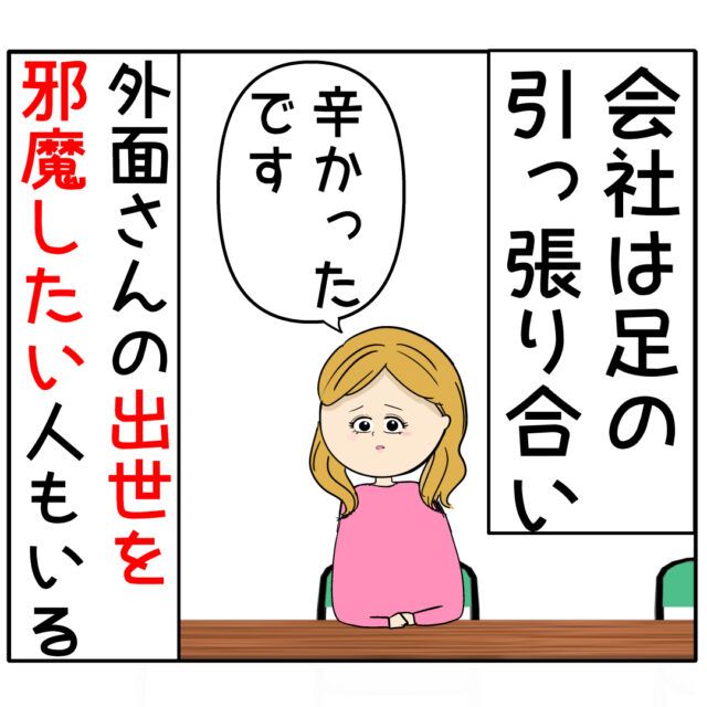 ふり子さんは「辛かったです」と被害者アピール。しかし、心の中では全く別のことを思っていました。「会社は足の引っ張り合い。外面さんの出世を邪魔したい人もいる」