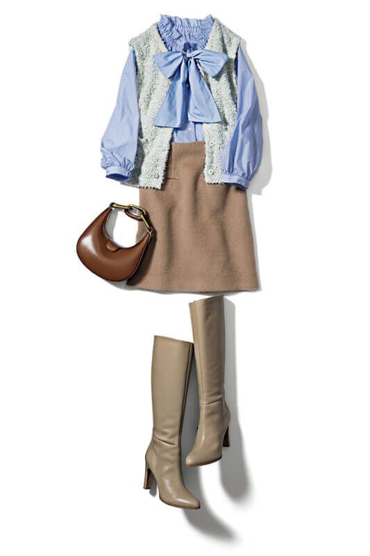 ベスト/着回し ブルーブラウス¥16,500/ストロベリーフィールズ(シュガー・マトリックス) スカート¥9,999/NATURAL BEAUTY BASIC バッグ¥11,900/CHARLES & KEITH 靴¥43,450/ダイアナ(ダイアナ 銀座本店)