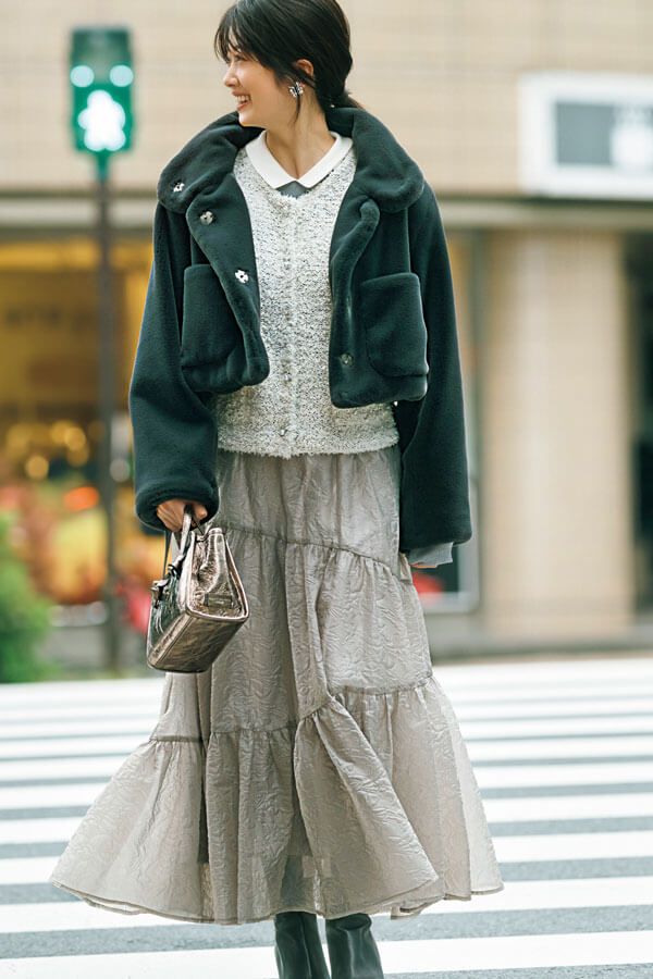 7℃前後の日は…ファーアウター+ベスト+ティアードスカート