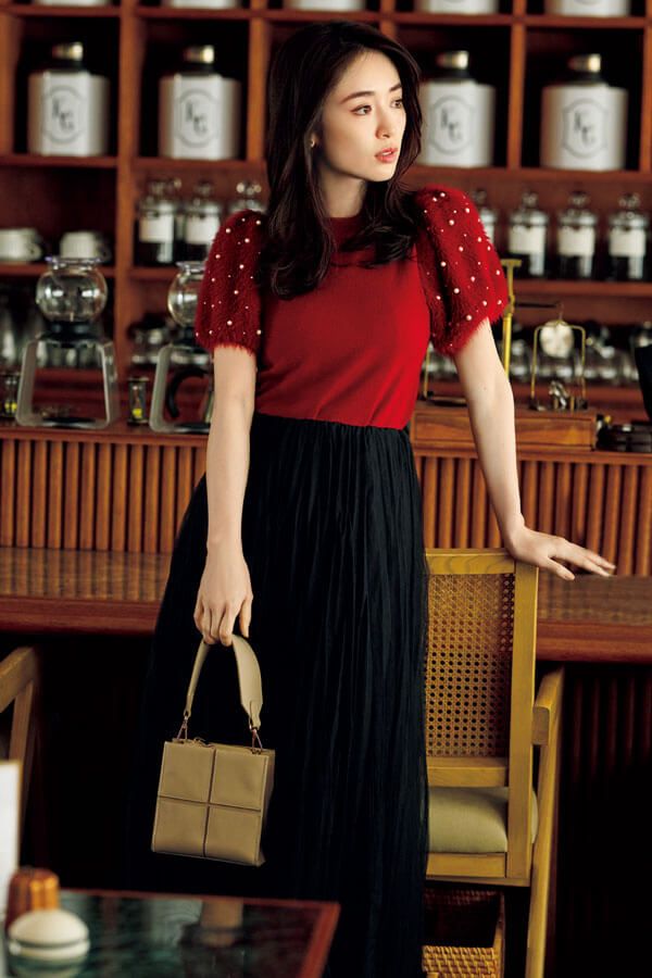 フェザー素材のパフスリーブに、小粒パールをたっぷりちりばめた1枚が、顔まわりを彩ってくれるのでアクセなしでもこんなに華やか♡ 目を引くボルドーカラーもホリデーシーズンのイベントやデートにぴったりです。