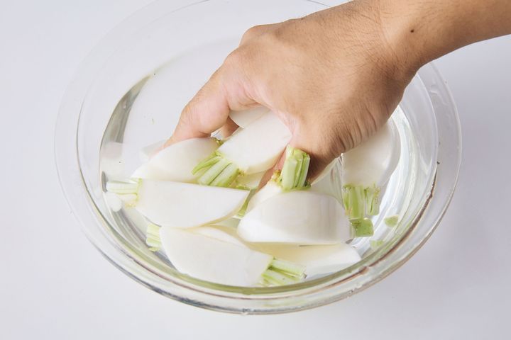 かぶはよく洗い、茎を1cmほど残して葉を切り、縦に皮をむいてから縦6等分に切る(皮はとっておく)。ボールに入れ、かぶるくらいの水を加えてよく洗う。かぶの葉は幅5mmに切る。しょうがは皮をむき、せん切りにする。片栗粉大さじ1と水大さじ1と1/2を混ぜ、水溶き片栗粉を作る。