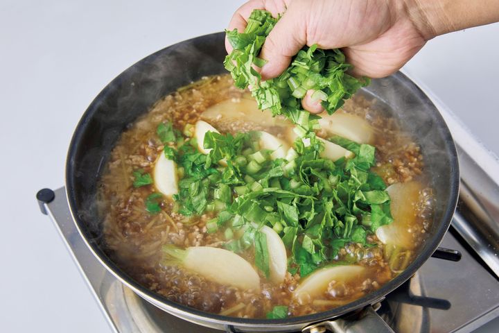 フライパンにごま油大さじ1/2を中火で熱し、ひき肉、しょうがを炒める。肉がパラッとしたらかぶとAを加える。煮立ったらふたをして、弱めの中火で5~6分煮る。かぶの葉を加えて1分ほど煮て、しんなりしたら水溶き片栗粉をもう一度混ぜて回し入れ、大きく混ぜてとろみをつける。