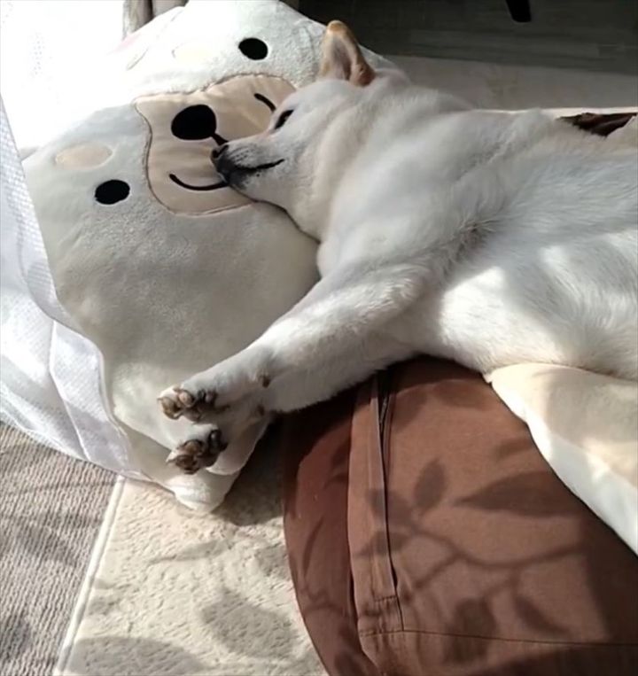 3. 大きなクッションの上で横になる柴犬。枕も用意してもらってお昼寝する様子に「熟睡しましたね」「幸せそう」
