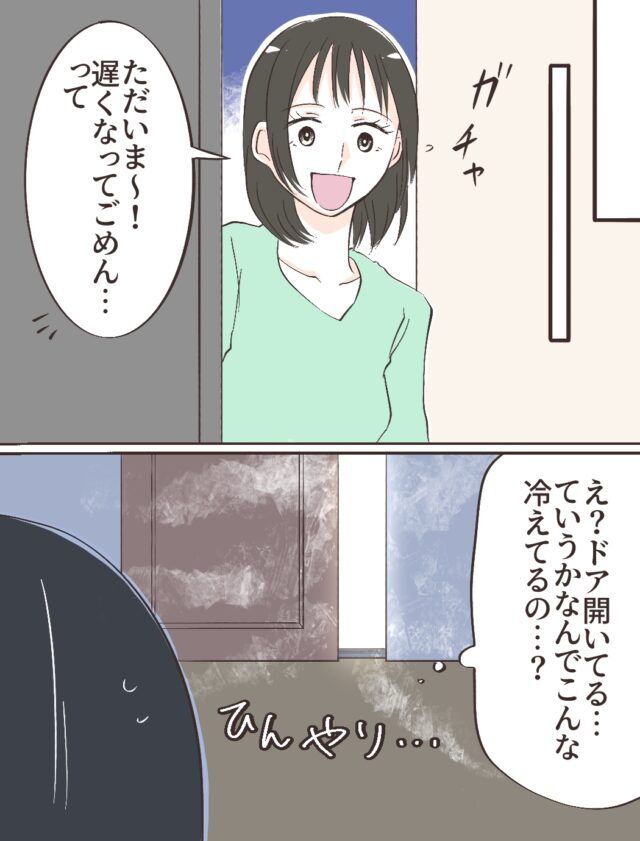 そしてバイトが終わり、タモツさんが待つ家に帰ったまひろさん、「ただいま~!遅くなってごめん・・って、え?ドア開いてる・・ていうかなんでこんな冷えてるの?」少しだけ開いたリビングのドアの隙間から流れ出るひんやりした空気を感じて、まひろさんは不思議に思いました。
