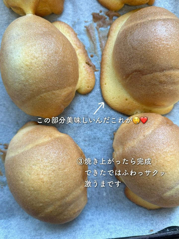 3.焼き上がったら完成!焼きたてはふわふわのサクサクです。広がって焼けた耳がまた絶品ですよ。