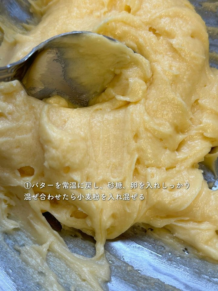1.バターを常温に戻し、砂糖、卵を入れてしっかりと混ぜ合わせる。次に小麦粉を入れまぜる。