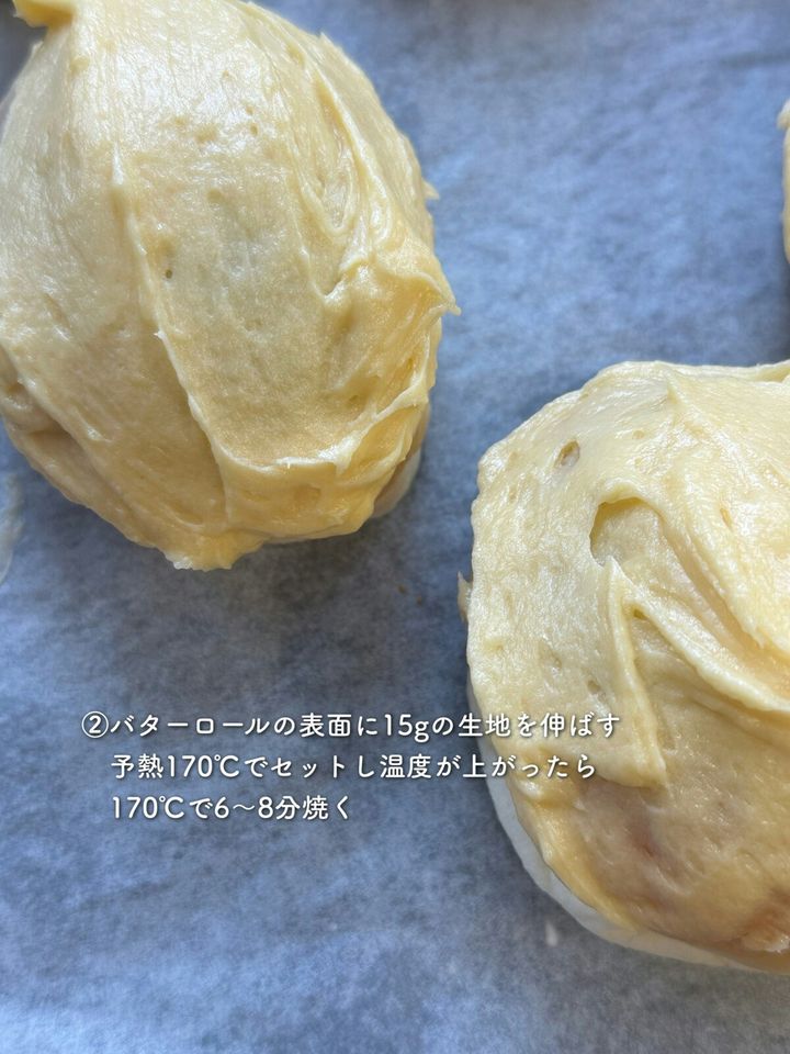 2.バターロールの表面に15gの生地を伸ばす。オーブンを予熱する。170℃でセットし、温度が上がったら170℃で6〜8分焼く。