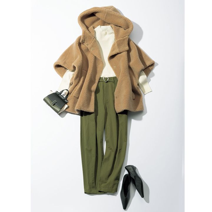 大きなフードは小顔効果が抜群。ボリューム感で華奢見えも期待できるボアジレ。柔らかなベージュがどんなボトムスも上品に受け止めるので、カジュアル度の強いカーキのチノパンも女性らしく着こなせます。