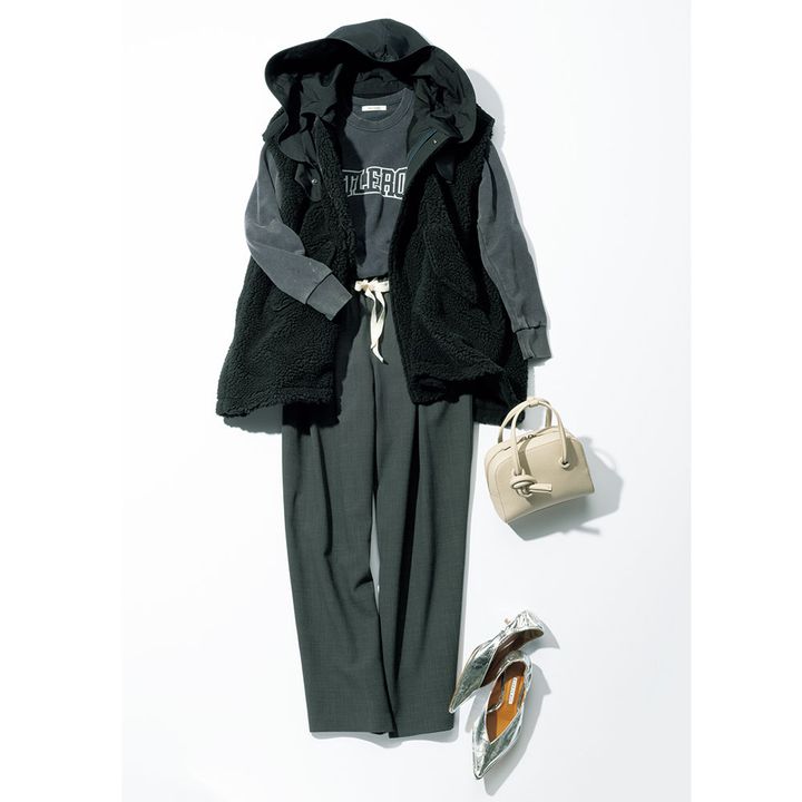 ボアコンビベスト¥71,500(ヴァシュモン×カオス/カオス 丸の内)Tシャツ¥19,800(ウィム ガゼット/ウィム ガゼット 青山店)パンツ¥49,500(ギャルリー・ヴィー/ギャルリー・ヴィー 丸の内店)バッグ¥46,200(ヴァジック/ヴァジックジャパン)パンプス¥39,600(PIPPICHIC/ベイジュ)