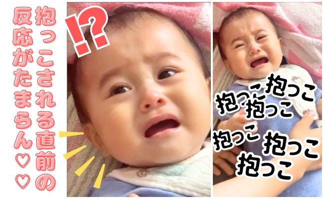 すぐに抱っこしようと、ママが再び脇の下に手を入れると、また一瞬で泣き止んで、「きゅるん♡」。