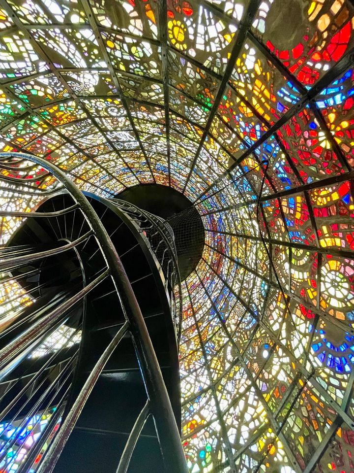 円筒形の建物一面にステンドグラスに囲まれ、自然光が差し込みキラキラ輝く作品は、必ず写真を撮りたくなる映えスポット