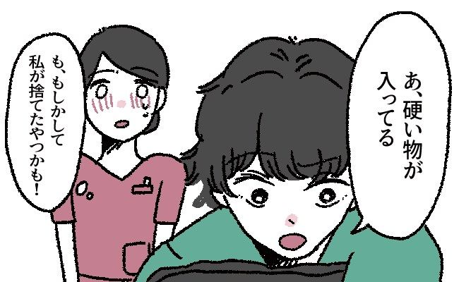 ゴミの件をすっかり忘れたその日の帰り。小さな医療器具が紛失し、「間違えてゴミ箱に捨てた可能性がある!」とスタッフ総出での大捜索が始まりました。私も男性医師と捜索。あるゴミに気づいた先生が「あ! なんか硬い物が入ってる! これかもしれない!」と言ってグルグル巻きのトイレットペーパーをほどいたら、中には私の捨てたタンポンが……。