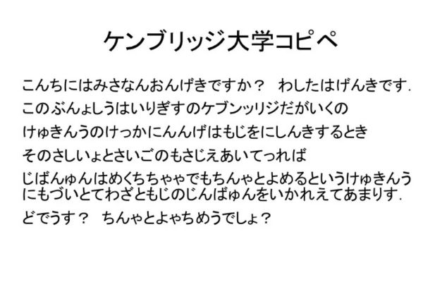 これは元ネタは海外ですが、日本語でも成立するため、日本のネット上でも、「ちんゃと よゃちめうコピペ」として広まっていました。みなさんも下のようなコピペ文を見かけたことがあるでしょう。