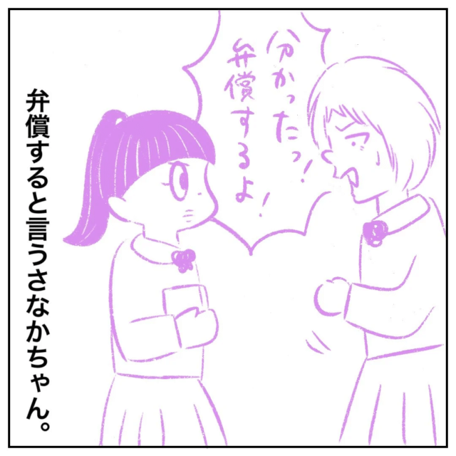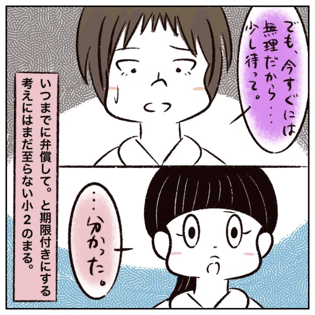 「でも、今すぐには無理だから・・・少し待って」とさなかちゃんに言われ、まるさんは「分かった」と了承します。このとき小学2年生だったまるさんは、「いつまでに弁償して」と期限付きにするという考えにはまだ至りませんでした。