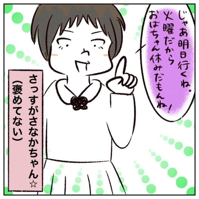しかし。「じゃあ明日行くね。火曜だからおばちゃん休みだもんね!」と、まるさんのお母さんの休みをちゃっかり把握しているさなかちゃんが有無を言わさず遊ぶ約束を取りつけてきました。さなかちゃん、さすがですね。
