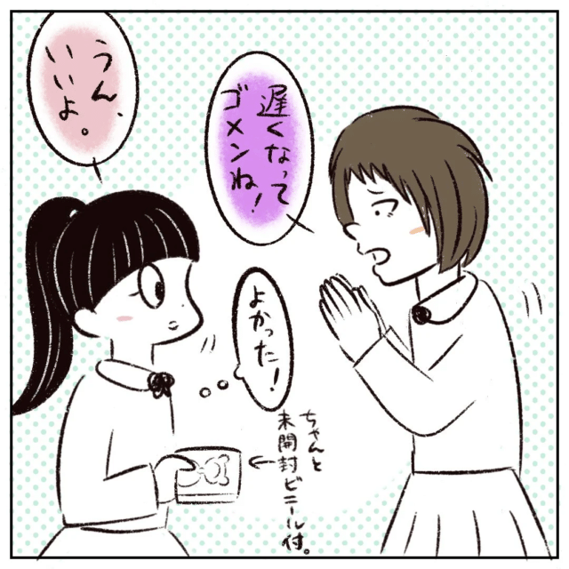 「遅くなってゴメンね!」と謝罪の言葉もあり、まるさんは「うん、いいよ」と言って受け取りました。マンガはちゃんとビニール付きで未開封の新品だとわかり「よかった」とホッとしたまるさん。