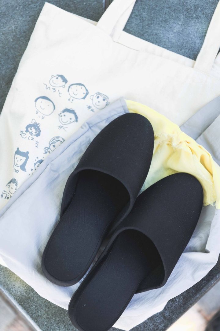 「折りたたむ煩わしさがなくサッと収納でき、使い勝手抜群のスリッパ。かかと部分がゴムになっており脱げにくく、中敷きのクッションがふわふわで足も疲れにくいです。靴袋を広げれば、外履きを収納できるようになっているところも気に入っています」坂倉安奈さん・35歳(公立小学校6歳女の子と私立幼稚園3歳女の子のママ)