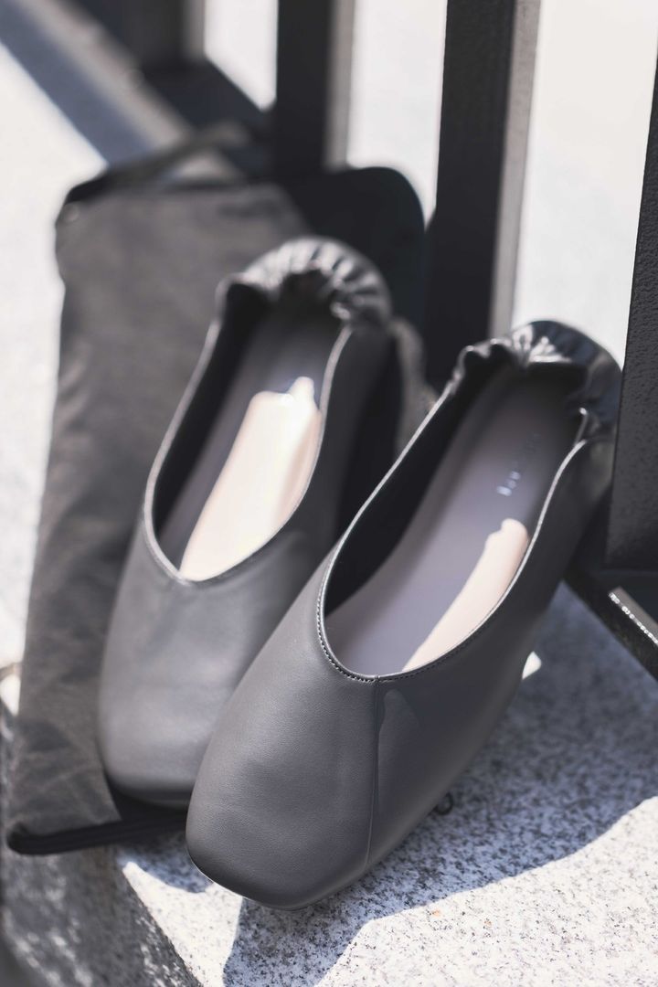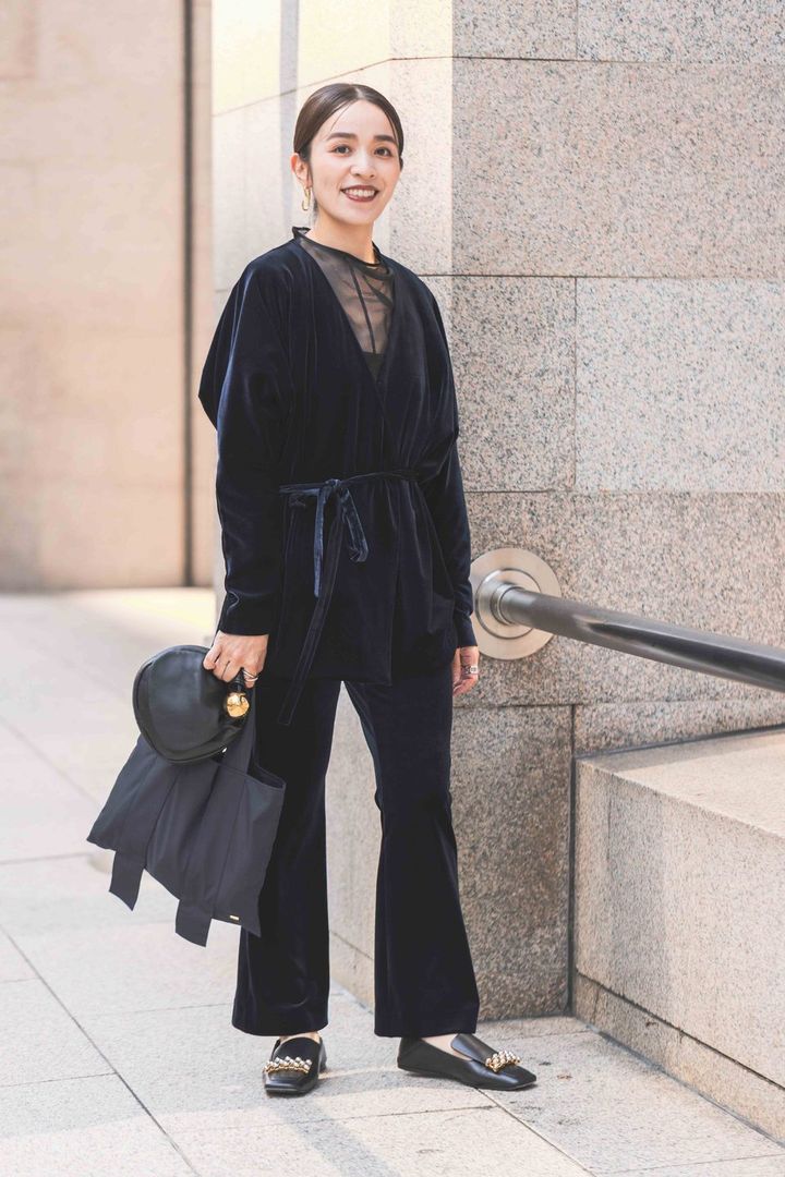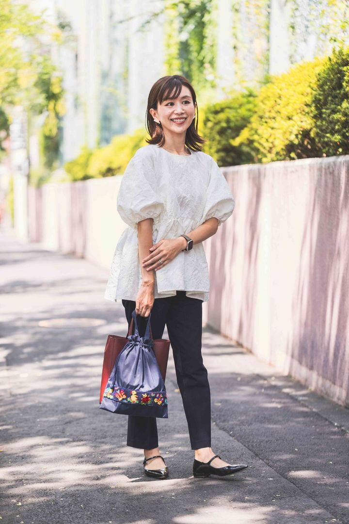 「VERYを見て知ったレプリエノイエの室内履きはコンパクトに収納でき、靴袋を外履き入れのバッグとしても使えるので重宝しています。モード感のあるエッジの効いたデザインもお気に入りで、どんなコーデにも馴染んでくれるので助かります」佐々木千紘さん・35歳(公立小学校6歳男の子と保育園4歳女の子のママ)