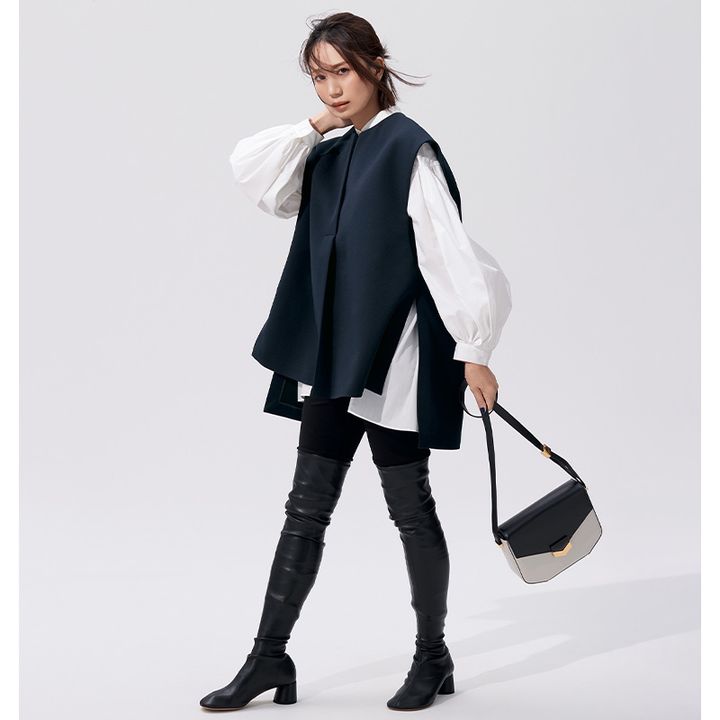 インナー次第で着回せるジレは秋冬こそ頼りになる存在。ブラウスの魅力を損なうことなく活かす、計算し尽くされたサイドの深めアームホール&スリットのおかげでニットなど地厚なトップスを重ねても、ゆとりをキープして軽やかに。表情豊かなジレのシルエットと細身ボトムスとのギャップで360度ドラマティックな着こなしに。