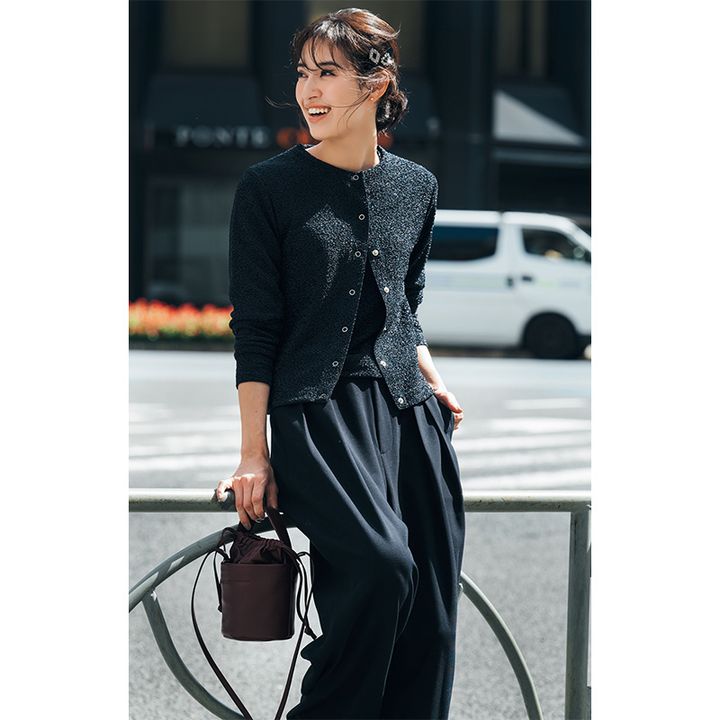 カーディガン¥18,700(ミースロエ)スカート¥29,700(エトレトウキョウ)ピアス¥24,200(ローラ ロンバルディ/八木通商)バッグ¥99,000(J&M デヴィッドソン/J&M デヴィッドソン カスタマーセンター)