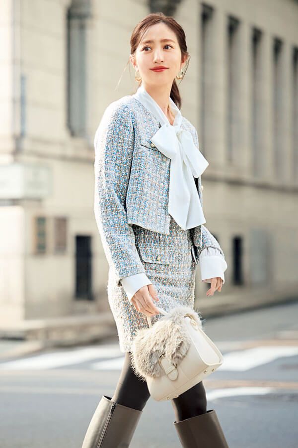 素材で令嬢風を作るならツイードを選んでおけば間違いなし。さらっとシンプルに着るだけでも、華やかさが格段にアップ。爽やかなサックスブルーを選ぶことで新鮮な令嬢スタイルが完成します。手持ちのカジュアルボトムとも相性抜群なボウタイブラウスも持っておけば、いつでも令嬢スタイルを楽しめます♪