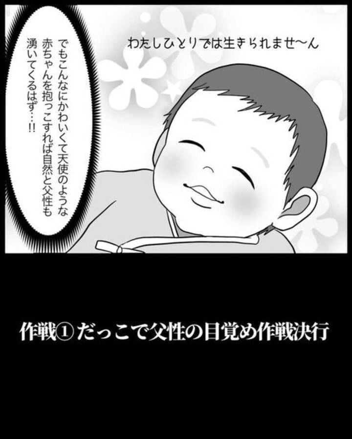 パパはママが妊娠中の十月十日、自分自身の環境は何も変わらず、ママに比べて「父性」が芽生えるまで時間が掛かるのかもしれません。マイペースなたまままさんの夫だと、より難しいかもしれません。そこで、たまままさんは第一に「抱っこで父性の目覚め作戦」を実行しました。赤ちゃんのかわいさは世界を救うほどのパワーがある気がしますが、抱っこの目的が理解できない夫には響かず。