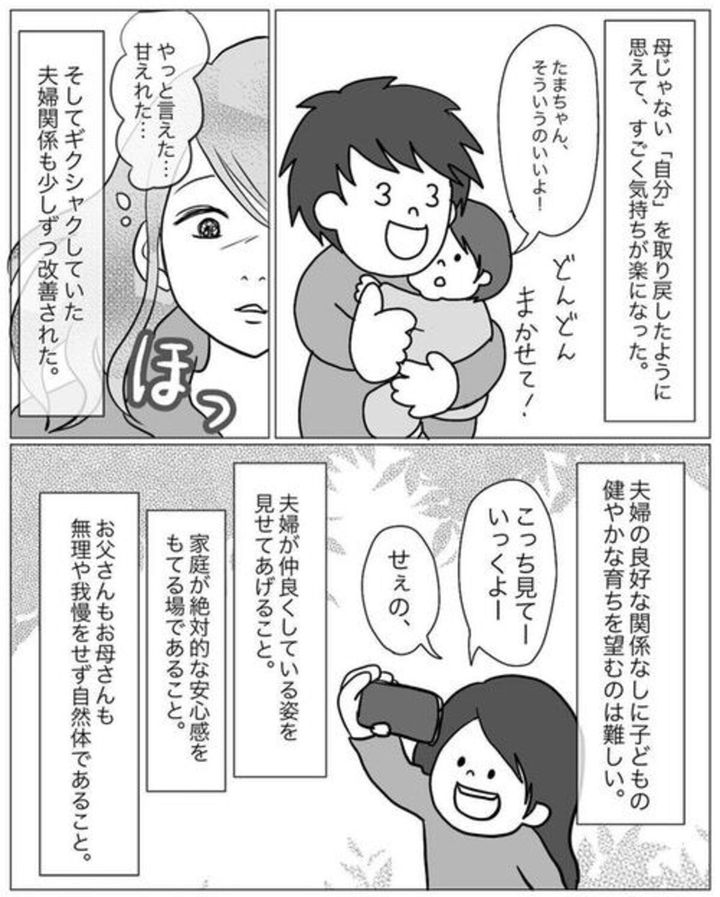 子どものみならず夫も育てるなんて、と絶望しそうになりますが、たまままさんのように作戦を立てて実行していくことで、夫に変化が見られ、たまままさん自身も報われた気持ちになりますね。