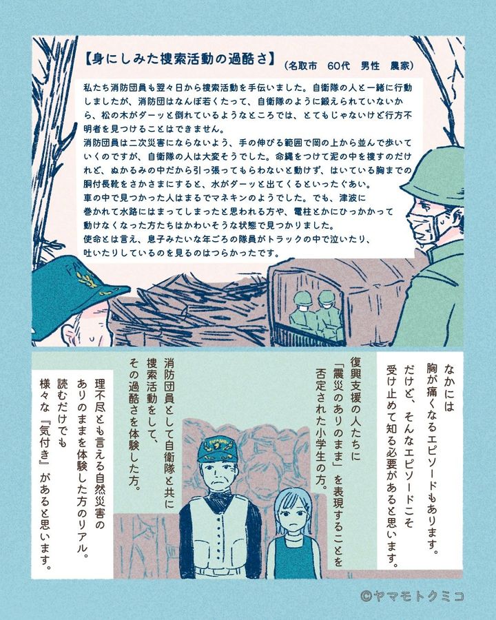 元海上自衛隊のイラストレーター・ヤマモトクミコさんが、東日本大震災の支援を通じて学んだことをマンガでお伝えする連載「元自衛隊員が描く“こころの防災”」。