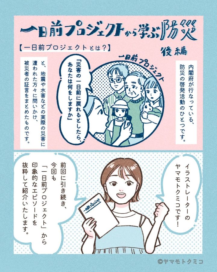 内閣府のHPによると、一日前プロジェクトは、「取りまとめたエピソードを広く活用・普及させることで、地域のコミュニティや国民一人ひとりに防災・減災への関心や意識を高めていただく」ことが目的のものです。