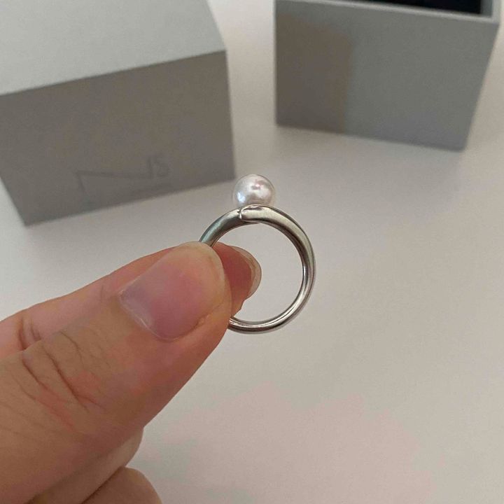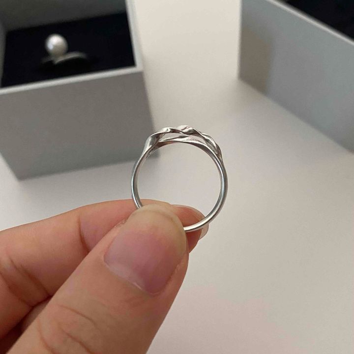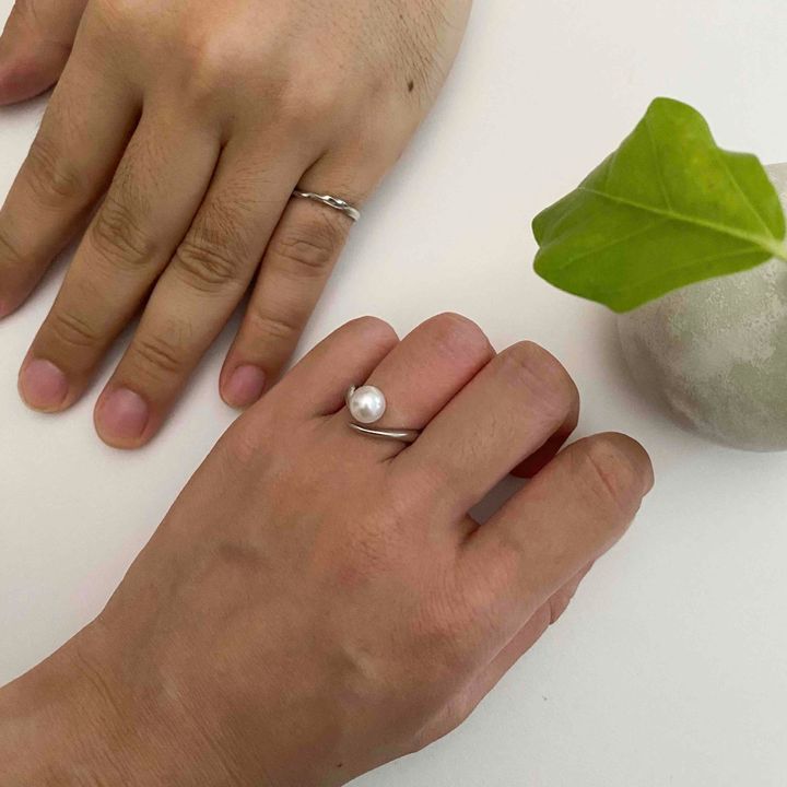 私は、アコヤパールを包むようにしなやかに流れる錫のリボンが可愛らしいリングを薬指に。一方、だんなさんは、立体的に交差する2本のリボンがさりげなく個性的なリングをピンキーリングとして選択。