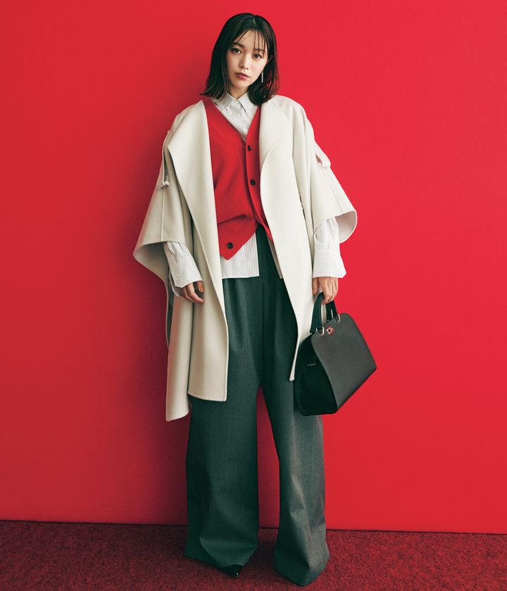 中に着込むアイテムを問わず、軽やかに纏えるスリーブレスコートはこの冬の注目アウター。歩くと風をはらむポンチョタイプは通勤コーデをドラマチックに魅せてくれます。ダークな冬の街に映える明るめのニュアンスカラーも高ポイント。旬の赤を効かせて洒落感も気分もUP!