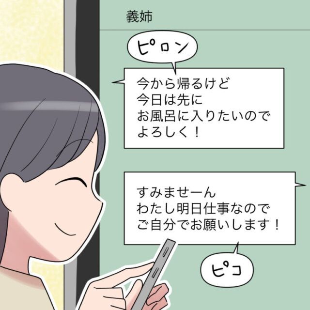 義姉から雑用を命じるメッセージが届いても、「明日、仕事なので」と断るカエデさんです。