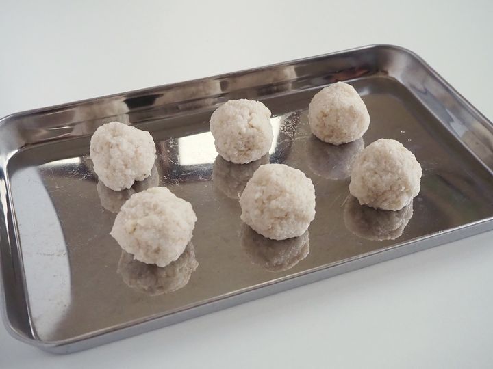 1. れんこんを皮付きのまますりおろしたら絞り、水分を50ml分取り除く。Aを加えて混ぜてから6等分にし、それぞれ丸める。