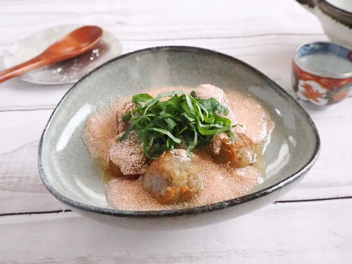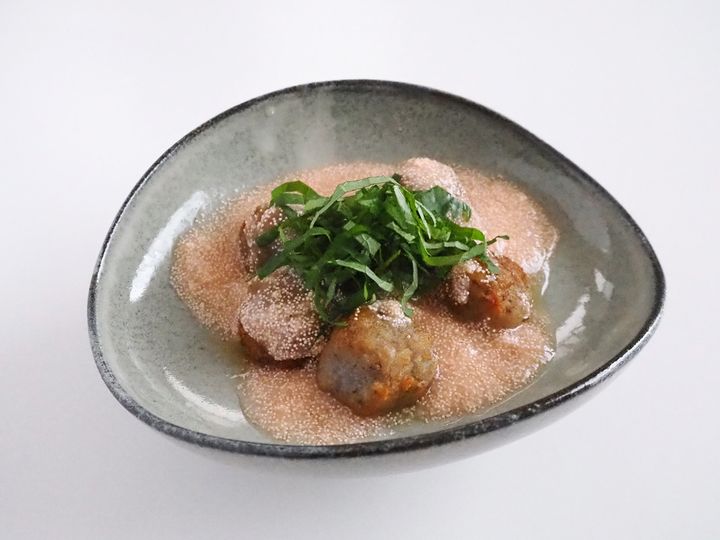 明太子と白だしベースのあんかけをたっぷりとかけ、大葉をトッピングしました。