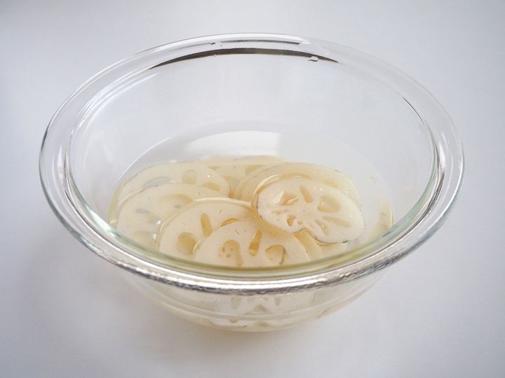 1. れんこんは皮付きのまま2~3mmの厚さにスライスし、酢水に5分程度さらす。