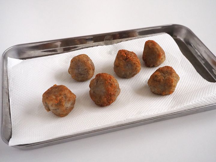2. フライパンに少し多めの油を加えて中火で熱し、全面がきつね色になるまで揚げ焼きにする。揚がったら、キッチンペーパーの上に取る。