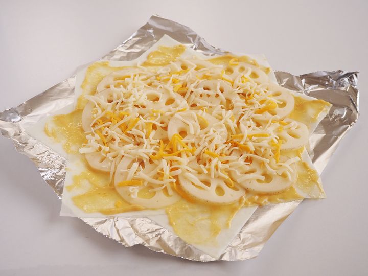 3. アルミホイルの上に春巻きの皮を2枚ずらして重ねる。2のソースを全体に塗ったら、その上に水気をしっかり拭き取ったれんこんを並べ、ピザ用チーズをかける。